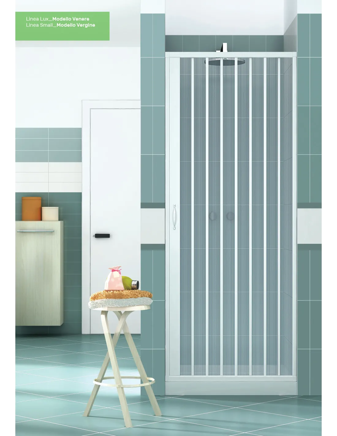 Grazie al sistema a soffietto, l’ingombro delle ante si riduce al minimo quando sono aperte, permettendo un passaggio comodo anche in docce strette.
