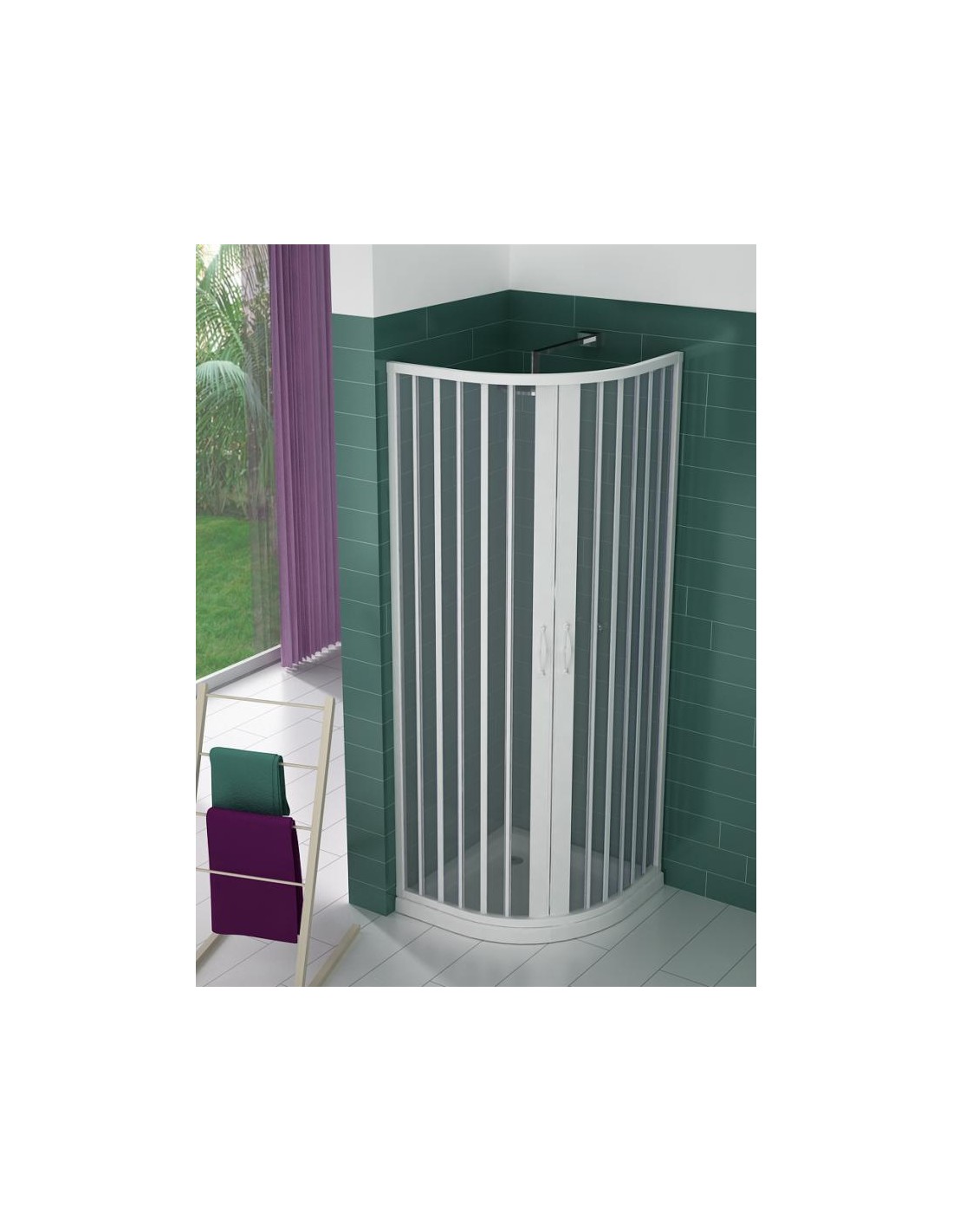 Box doccia estensibile in PVC, semicircolare, a due ante, con apertura centrale.