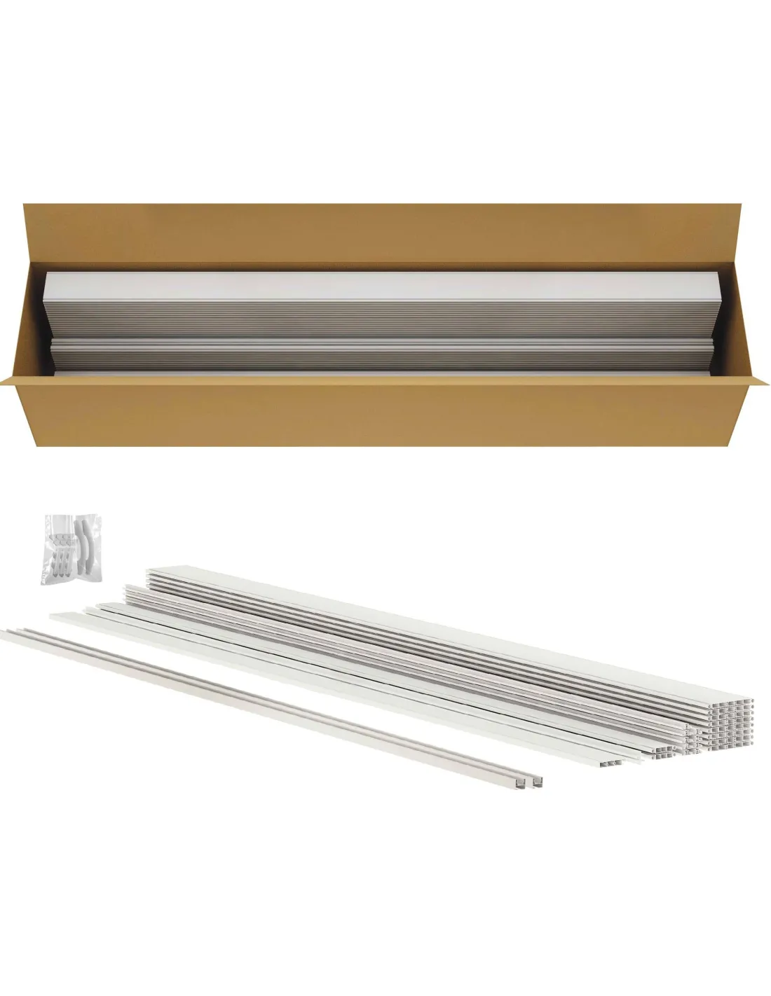 Il prezzo è fisso e comprende due guide laterali, una maniglia in plastica e una guida superiore, panelli large, cerniere, due mezzi pannelli e un pannello maniglia.