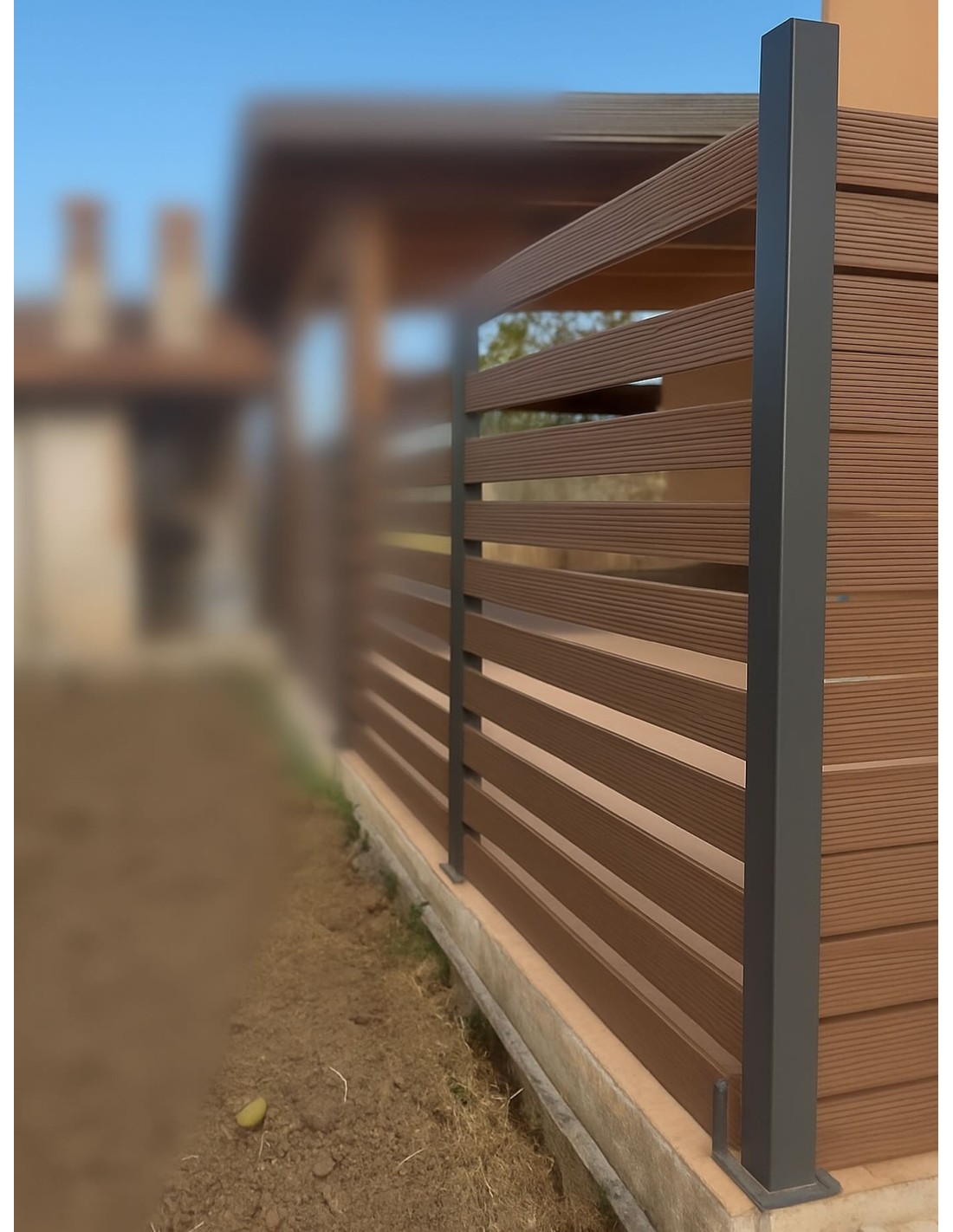 Recinzione moderna in WPC e alluminio effetto vedo-non-vedo, realizzata su misura a richiesta del cliente. Ideale per giardini e spazi esterni, offre design elegante, resistenza e privacy con il giusto passaggio d’aria.