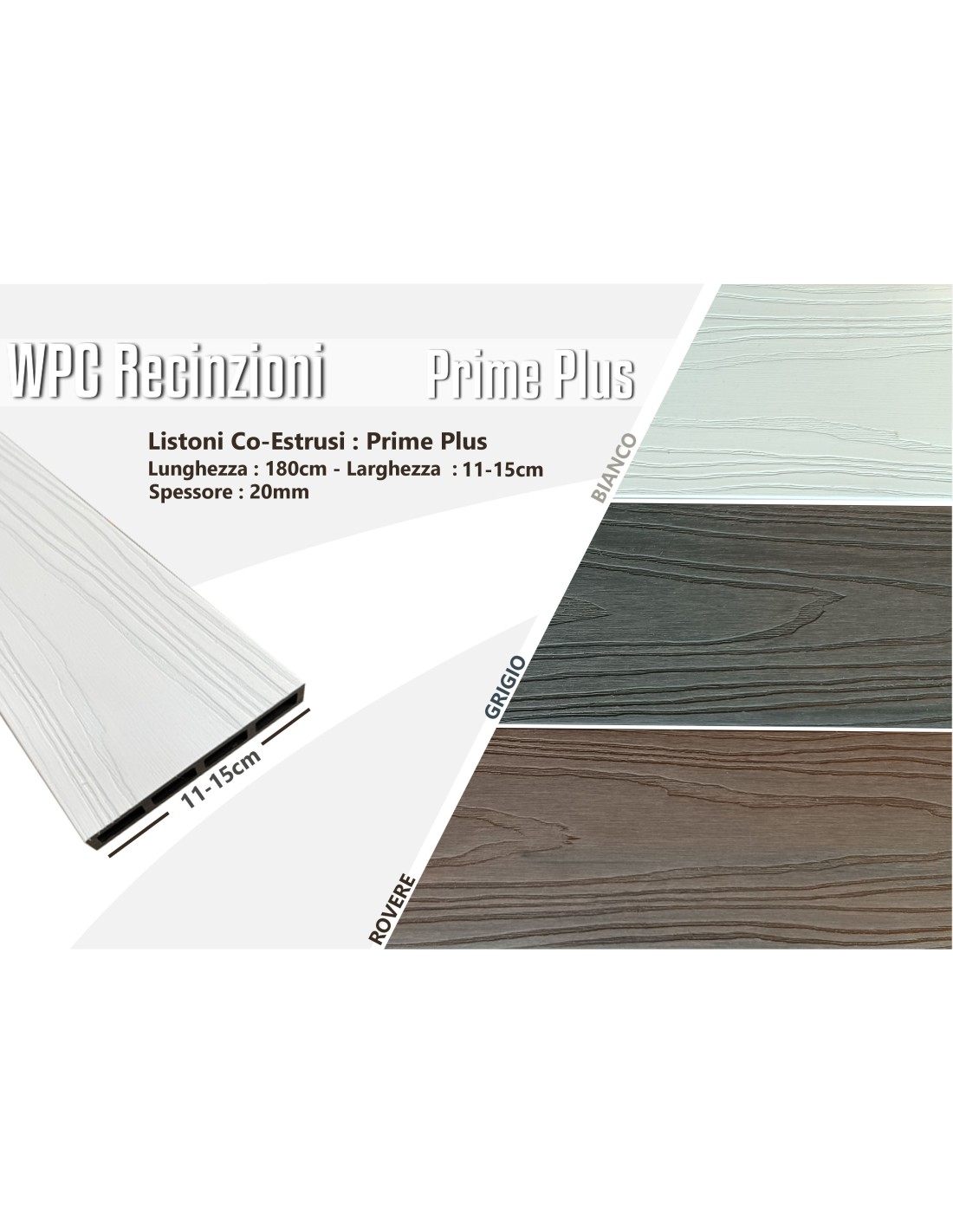 Seleziona il colore dei listoni in WPC che preferisci per la tua recinzione. I listoni sono realizzati in materiale composito ad alta resistenza, con finitura effetto legno o moderna, ideali per uso esterno. I colori reali possono variare leggermente in base alla luminosità e al dispositivo utilizzato.