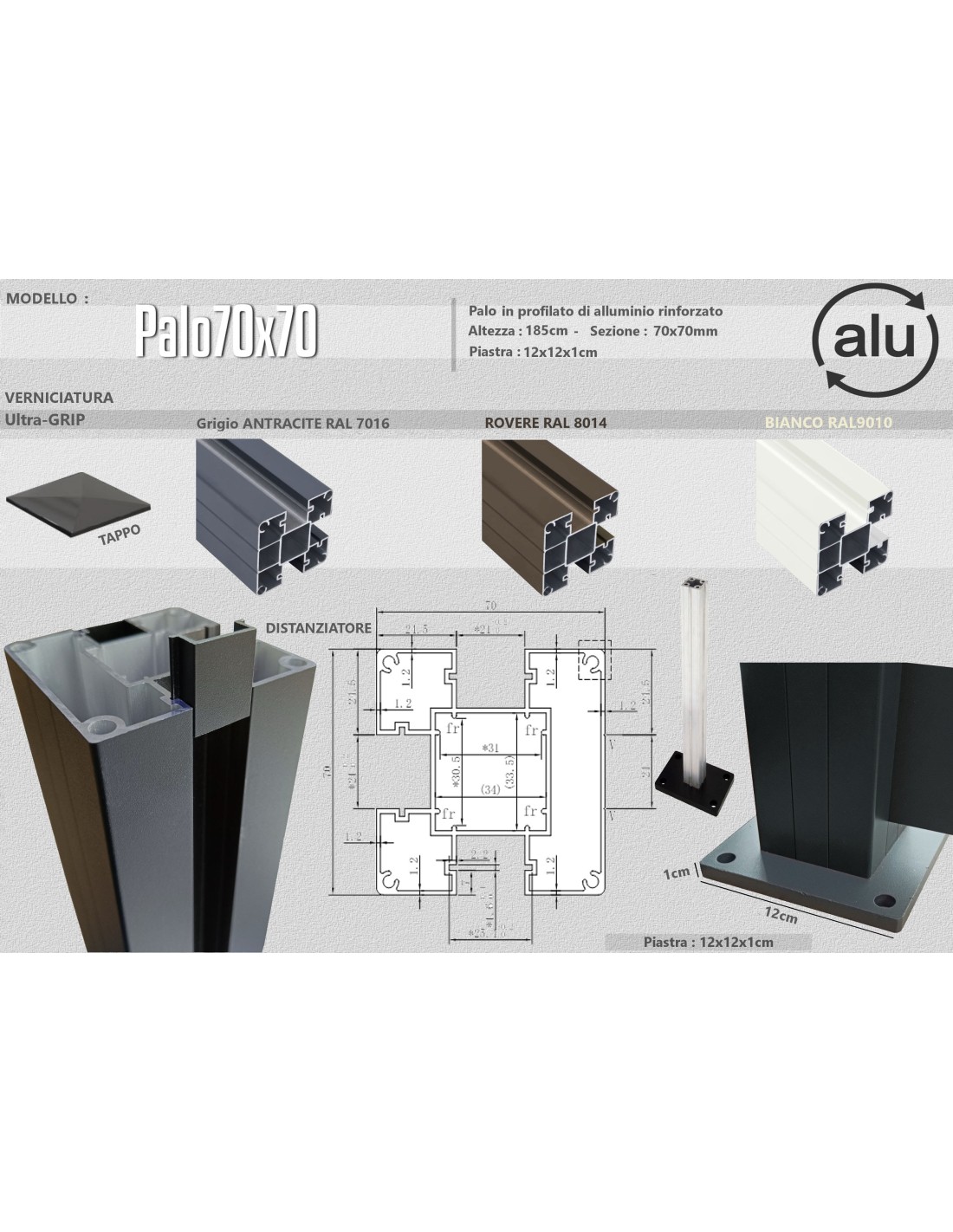 I pali in alluminio 70×70 mm garantiscono stabilità, resistenza e durata nel tempo. Ogni palo è fornito completo di tappo superiore e piastra di fissaggio alla base, pronti per l’installazione. Seleziona la finitura che preferisci in base allo stile della tua recinzione.